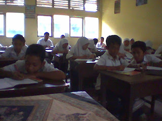 Bener aja, hari itu, ada lima belas siswa kelas VIII yang nggak ngerjain pe er! Mana saya cuma bikin tiga! Ya udah, gantian aja, tiga-tiga. Masuk ke tiap kelas bawa surat pengantar dari saya yang harus ditandatangani guru yang lagi ngajar di kelas tersebut.
